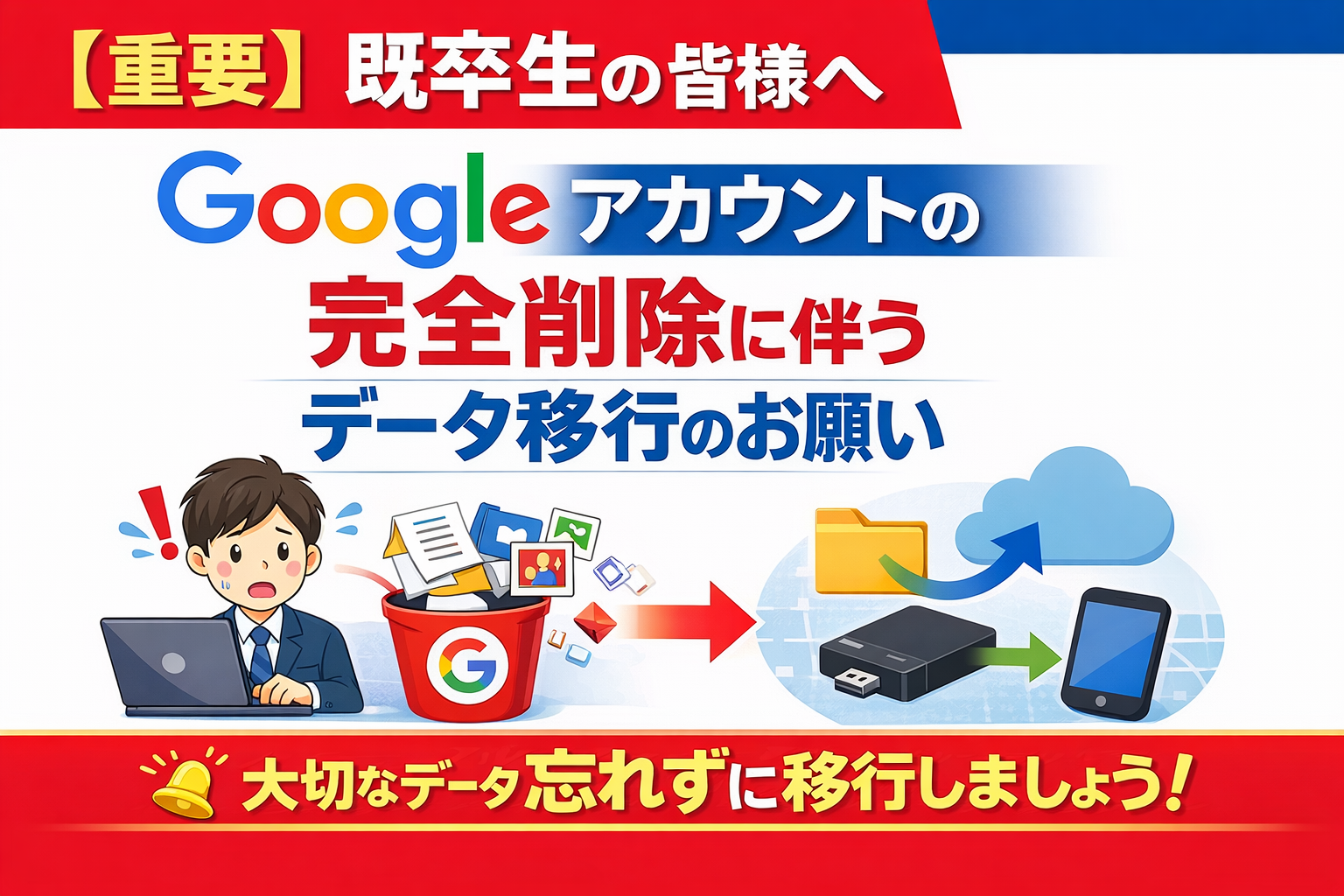 既卒生の皆様にお知らせいたします。 校名変更に伴い、既卒生が在学中に利用していた学習用Googleアカウント(@jhs....